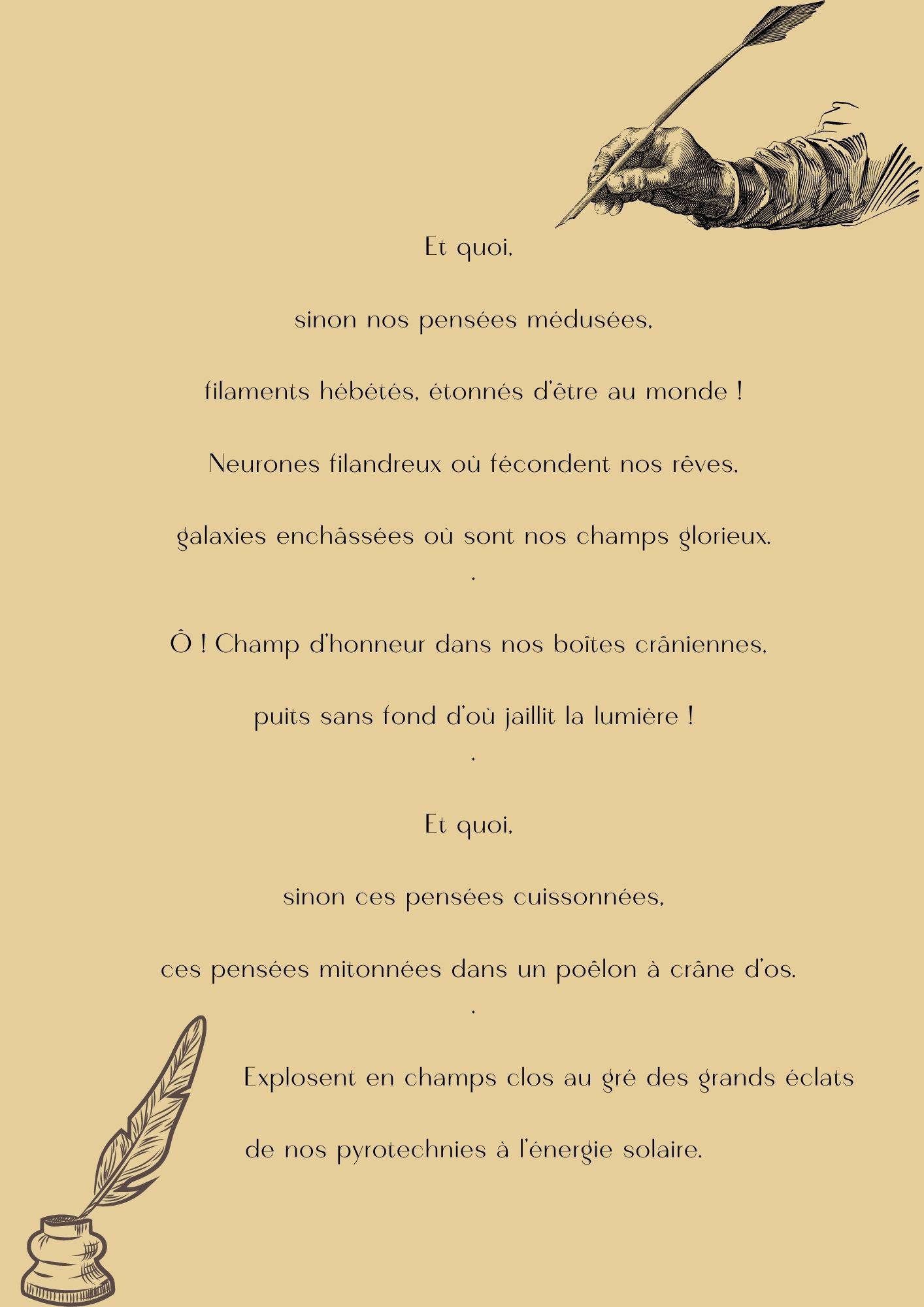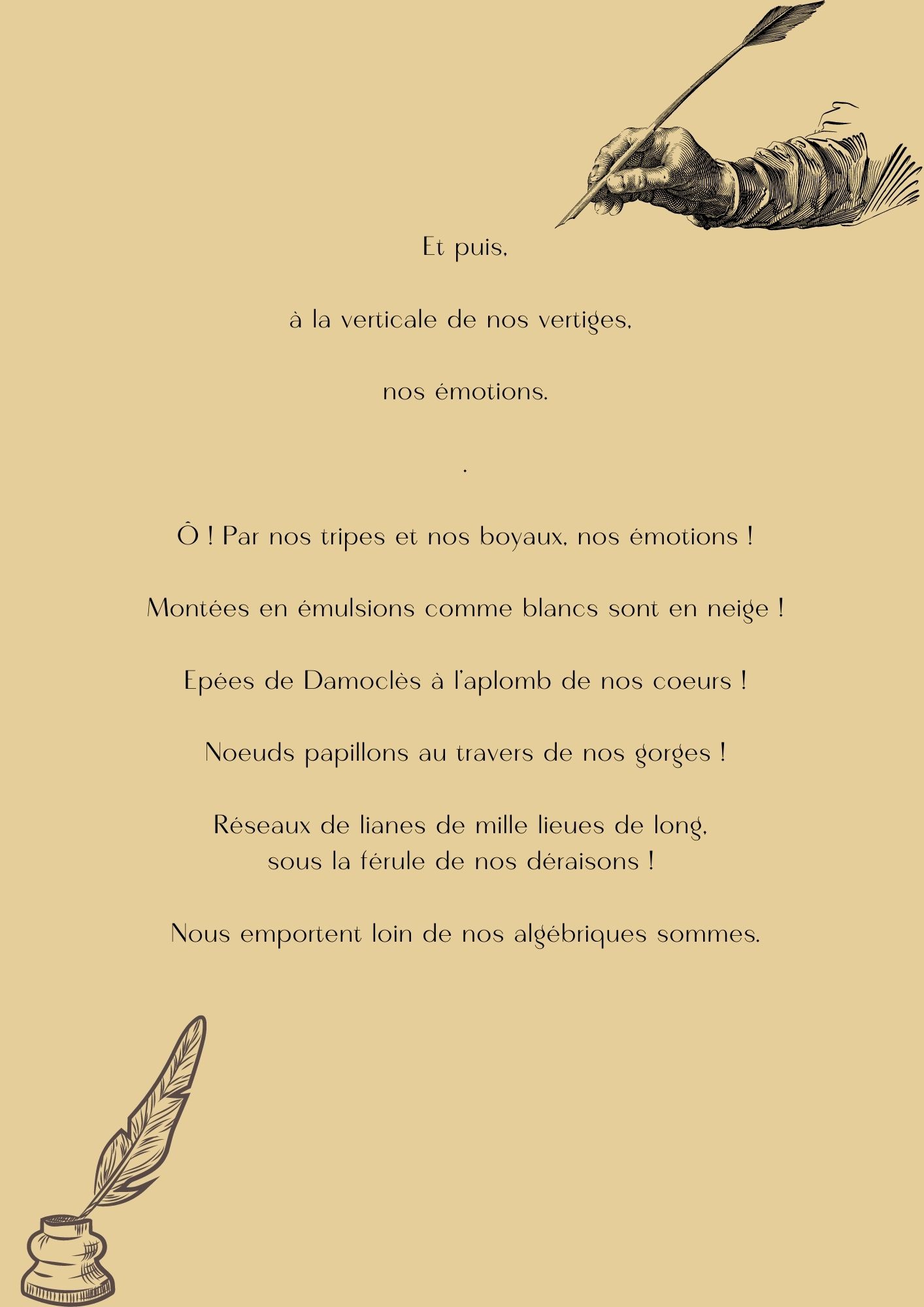 « Ô, par nos tripes et nos boyaux, nos émotions, montées en émulsions comme blancs sont en neige ».